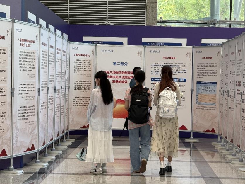 为深入贯彻落实中央八项规定精神,扎实推进作风建设常态化、长效化,根据学校党委统一部署,2025年6月4日,统计学院本科生第一、第二党支部组织全体党员前往主楼四季厅,集中参观学习“作风建设永远在路上——深入贯彻中央八项规定精神学习教育专题展览”。