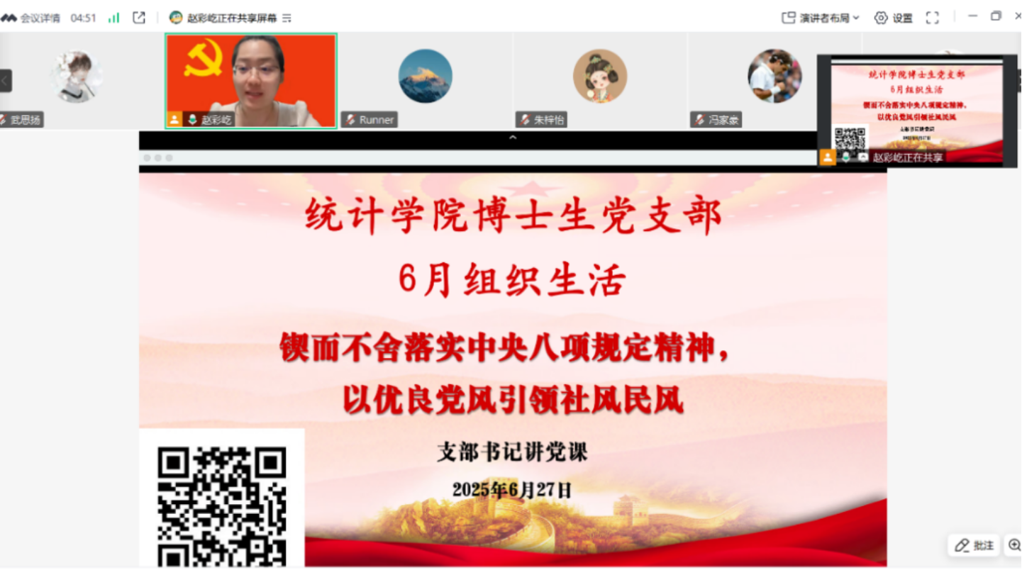 为深入学习领会中央八项规定精神,进一步提升党员党性修养,2025年6月27日,博士生党支部线上开展了支书讲党课——“锲而不舍落实中央八项规定精神,以优良党风引领社风民风”专题学习。本次党课由支部书记赵彩屹主讲。