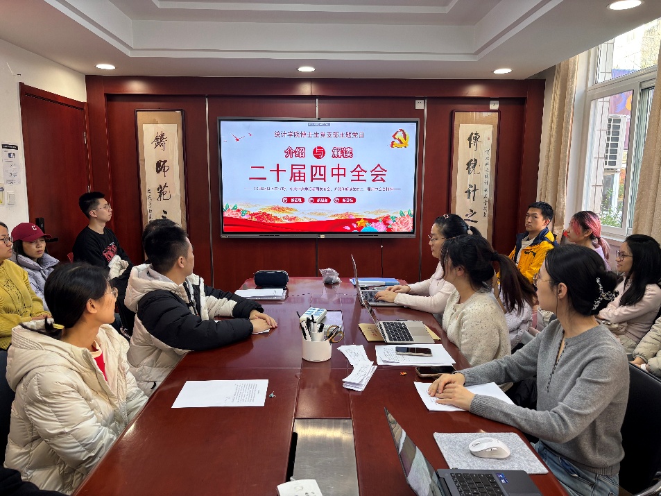 为深入学习贯彻党的二十届四中全会精神,准确把握“十五五”时期发展方略、强化博士生党员对国家战略的理解与认同,2025年11月19日,博士生党支部于统计学院104会议室开展学习贯彻党的二十届四中全会精神主题党日活动。本次活动由党支部书记赵彩屹主讲,全体党员和入党积极分子参会。