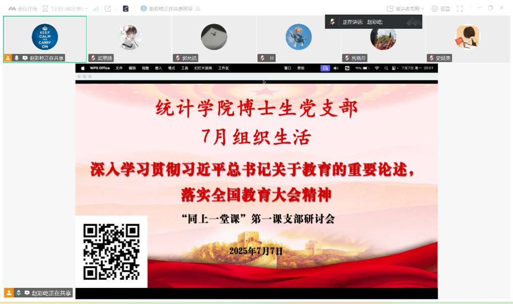 为扎实推进教育强国建设相关内容学习,全面落实全国教育大会精神,博士生党支部于2025年7月7日线上组织开展“同上一堂课”专题研讨会,围绕“深入学习贯彻习近平总书记关于教育的重要论述,落实全国教育大会精神”主题展开讨论,此次会议由支部书记赵彩屹主持。