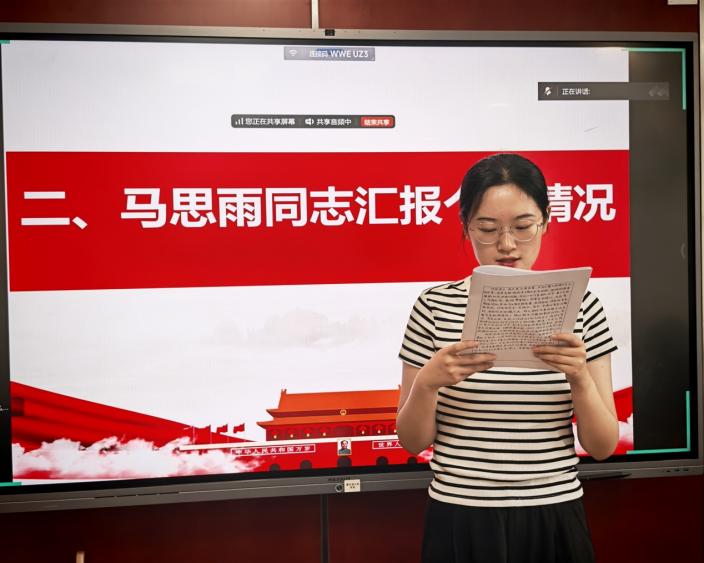 会议伊始,罗雅琪介绍了本次会议的会议内容、基本流程及出席情况。发展对象马思雨分别从理论学习、政治立场、专业学习和工作生活等各方面汇报了自己的个人情况以及今后的努力方向。随后,马思雨同志的入党介绍人对其思想觉悟、政治素养、培养考察情况作出全面介绍,支委会报告了关于马思雨同志的政治审查材料。
