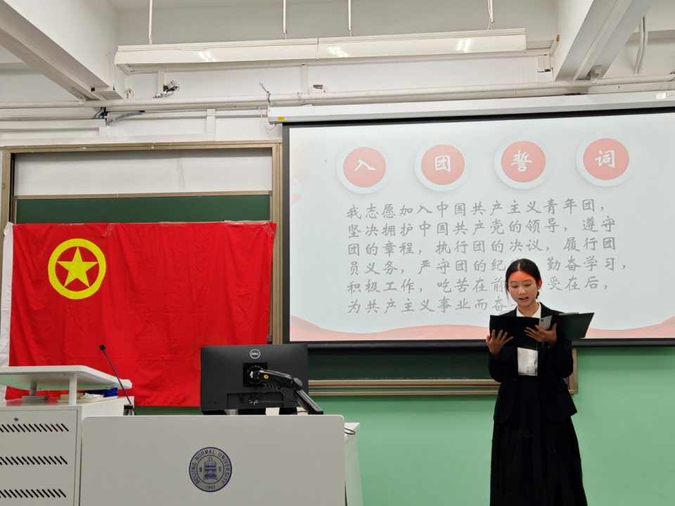 首先,全体起立,所有团员齐唱中国共产主义青年团团歌。随后,主持人带领同学们重温入团誓词。
