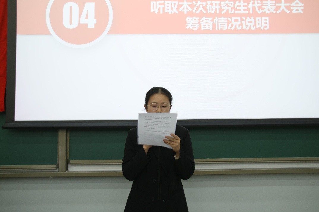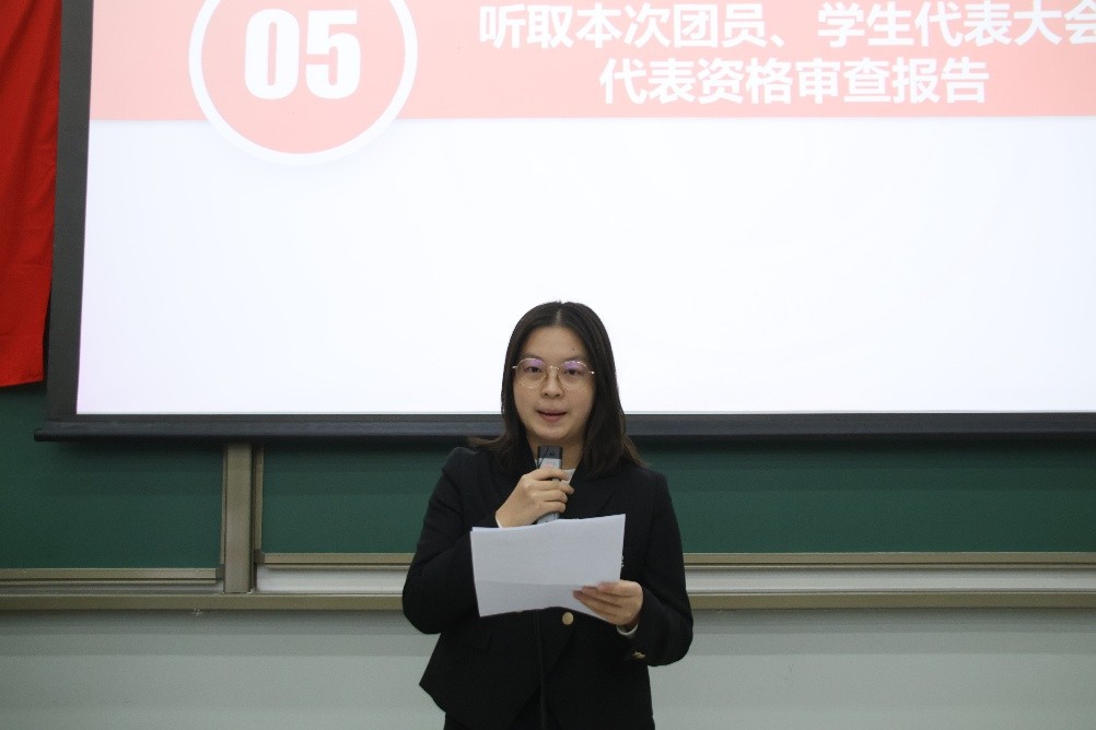 随后,我院团委办公室主任殷为宣读本次团员、学生代表大会筹备情况说明,研会办公室主任龚榆芸宣读本次研究生代表大会筹备情况说明,团委实践部部长欧阳雯茜宣读本次大会代表资格审查报告,经投票表决均审议通过。