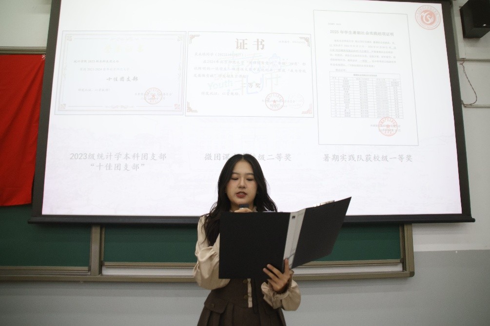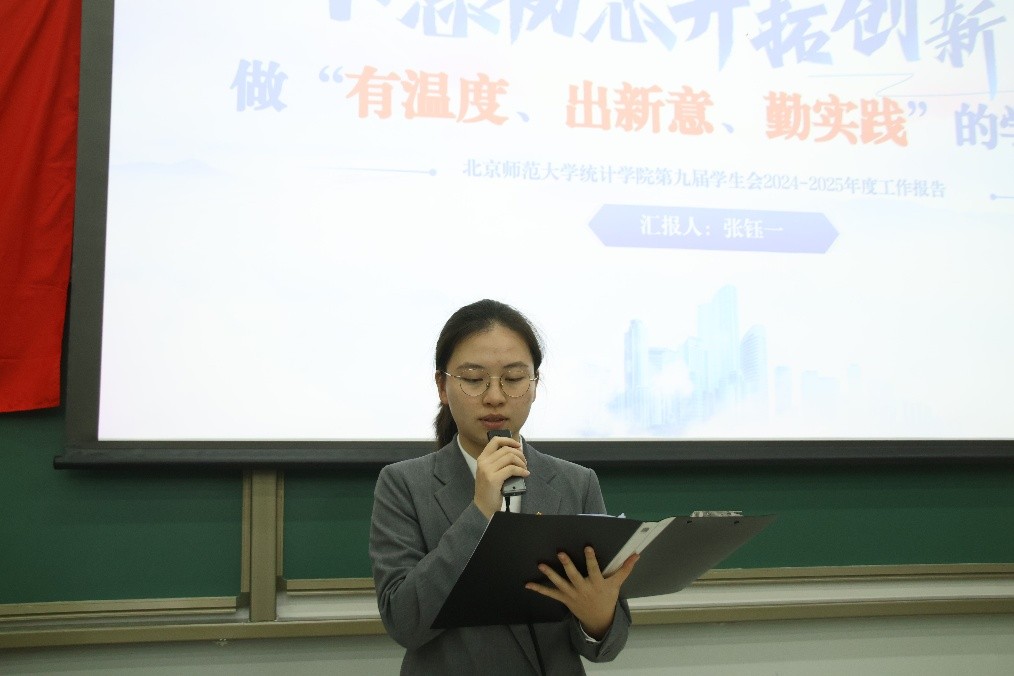2025年10月19日,统计学院第十次团员、学生代表大会、第十一次研究生代表大会在北京师范大学化学楼化一教室(海淀校园)顺利举行。学生会文艺部部长王艺涵主持会议。