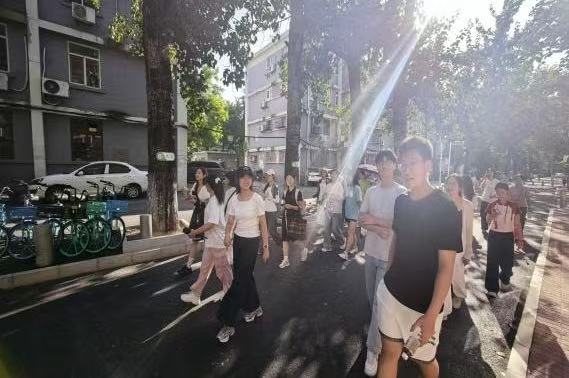 游园队伍从邱季端体育馆南门出发,沿着精心设计的路线前行。师兄师姐们不仅是“导游”,更是“校园百科全书”。在图书馆前,他们详细讲解了馆藏资源、借阅流程;行至京师广场和主楼,他们讲述了北师大百余年历史中的名家故事,将“学为人师,行为世范”的校训精神娓娓道来。路过教学楼时,师兄师姐们为新生详细介绍教学楼位置分布,随后将他们带领至统计学院小白楼,讲解了学院办公室的分布和职能。这些贴心的“干货”分享,瞬间拉近了彼此的距离,消除了新生们初来乍到的陌生与迷茫。
