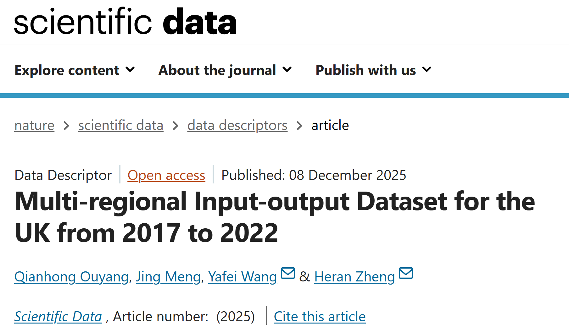 近日,我院2023级博士研究生欧阳乾弘(第一作者)与导师王亚菲教授(通讯作者)及合作者在《Scientific Data》期刊发表题为“Multi-regional Input-output Dataset for the UK from 2017 to 2022”论文,正式发布2017年至2022年英国多区域投入产出表。该项研究为分析英国区域经济结构、政策影响及供应链动态提供了高质量数据基础。