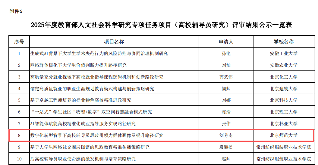 近日,教育部社会科学司公布了2025年度教育部人文社会科学研究一般项目评审结果。我院教师刘芳南申报的《数字化转型背景下高校辅导员思政引领力群体画像及提升路径研究》课题,作为专项任务项目(高校辅导员研究)获批立项。